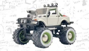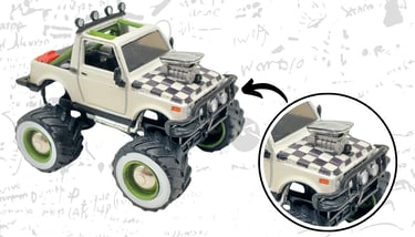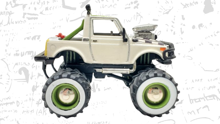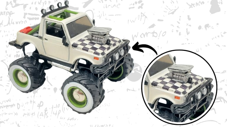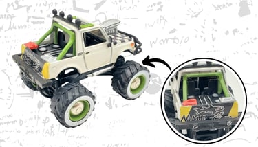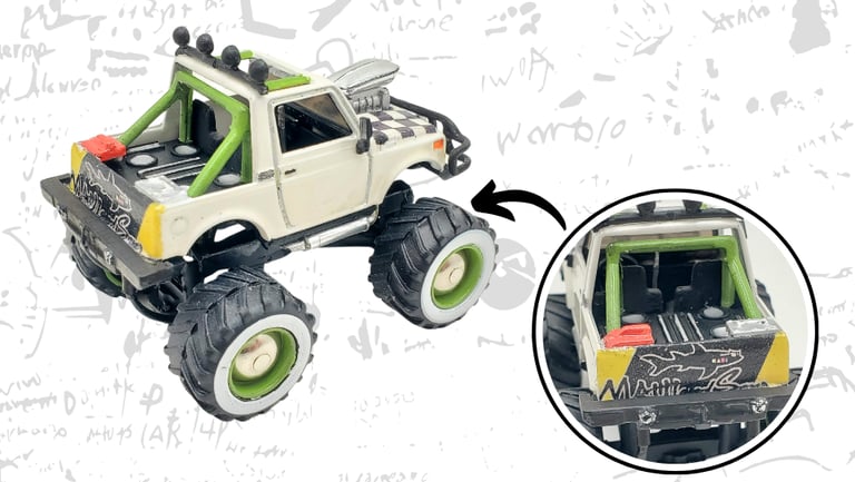 "The build started by combining a Hot Wheels Samurai with a shortened Jada Hummer base to fit perfectly underneath. Most of the Hummer’s accessories—like the grill guard, light rack, rear bumper, side mirrors, and speaker deck—found a new home on the Samurai. For a unique flair, I added white wall tires sourced from another Jada truck, pairing them with upholstery tacks as dish rims for a bold, retro-inspired look."