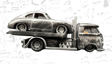 I closed off the back of the Kombi with a sheet of styrene, used aluminium tubing for the smoke stacks, and then moved on to painting. I went with a semi-gloss black and dry brushed silver over everything to bring out the details and give it a metallic finish. The Porsche got the same paint treatment.